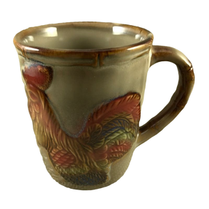 Features artwork depicting a colorful embossed rooster on the front exterior surface.