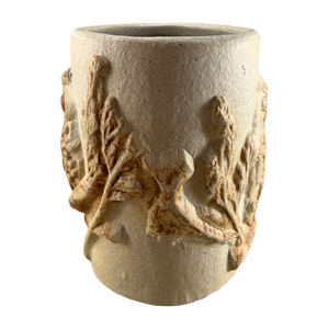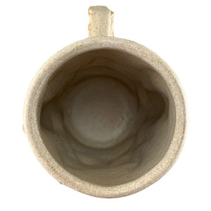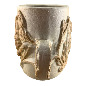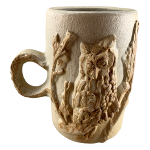 This is a hand made mug that features an owl sitting in a tree embossed on its front and rear surface.