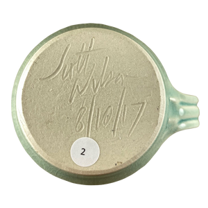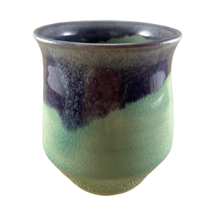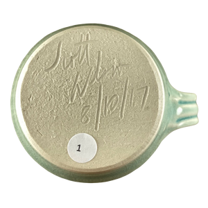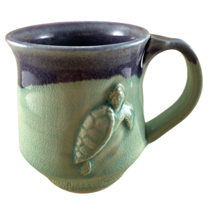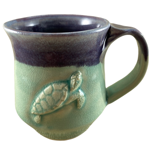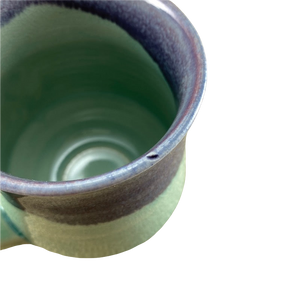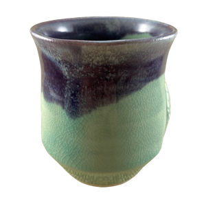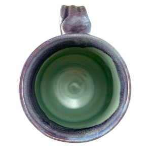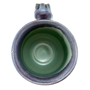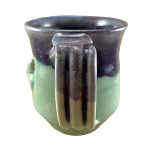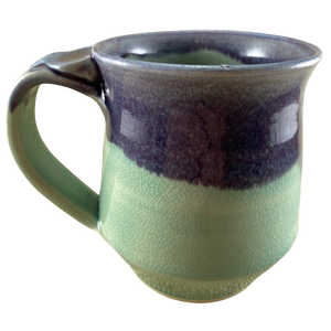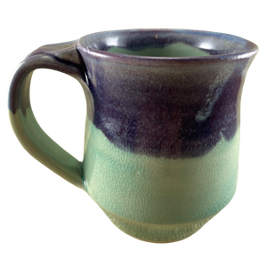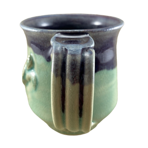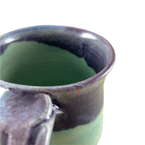 This is a gorgeous hand thrown mug that has a beautiful finish in several shades of blue and green.
