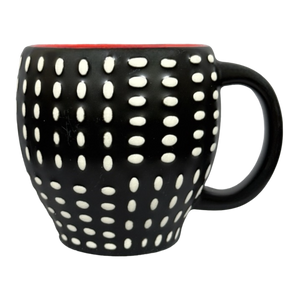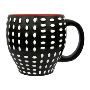 Features embossed white polka dots on a black background wrapping around its exterior surface.