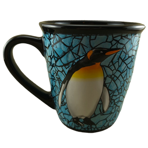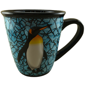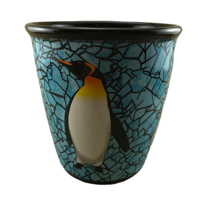 Features 3 emobossed images of emperor penguins on the exterior surface surrounded by a stained glass looking background.