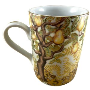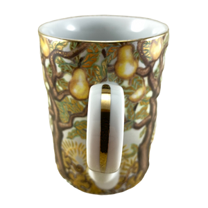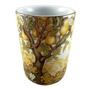 Features trees and pears with gold accents wrapping around its exterior surface.