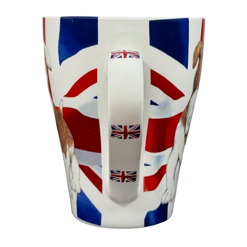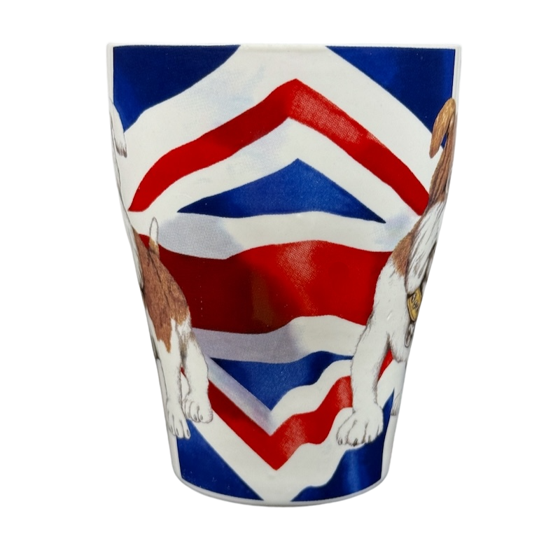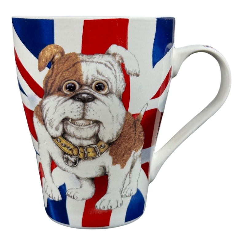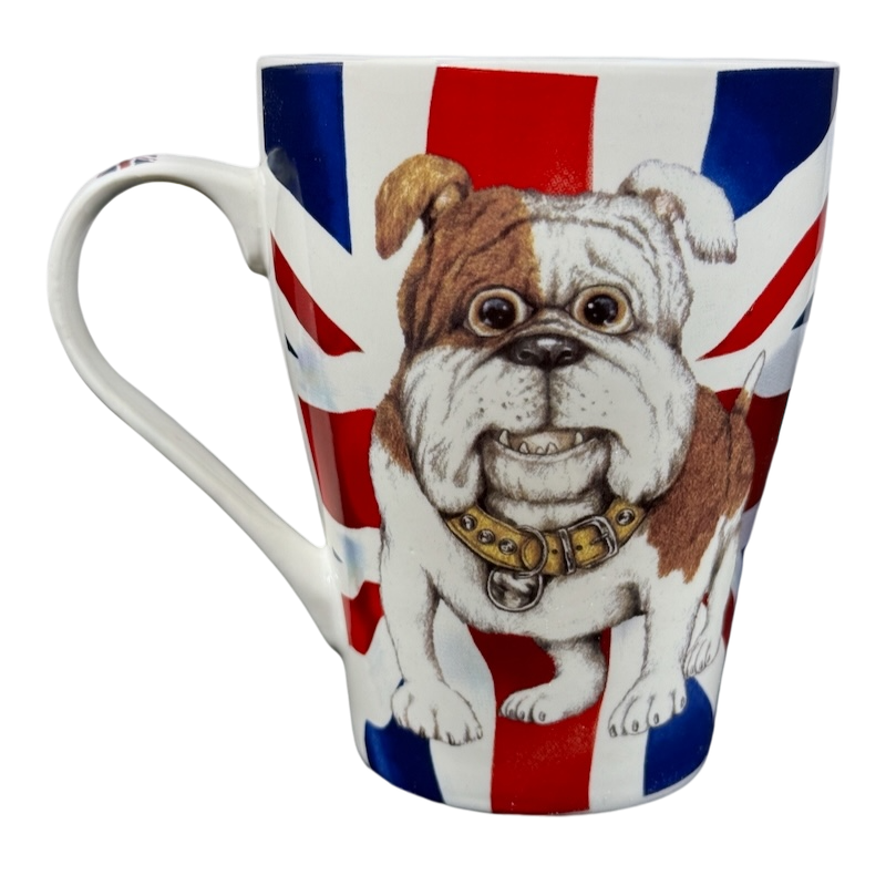 Features the same artwork on its front and rear surface depicting an English Bulldog standing in front of the Union jack flag.