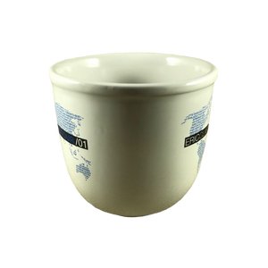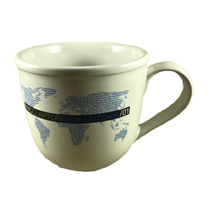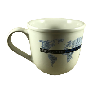 Features the same artwork on the front and the back of the mug consisting of "Eric Clapton World Tour 01" printed horizontally with a map above and below it. This map is cleverly made up of city names that the tour would visit that year.