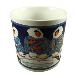 Features artwork on the exterior surface consisting of Inuit people fishing through a hole in the ice.