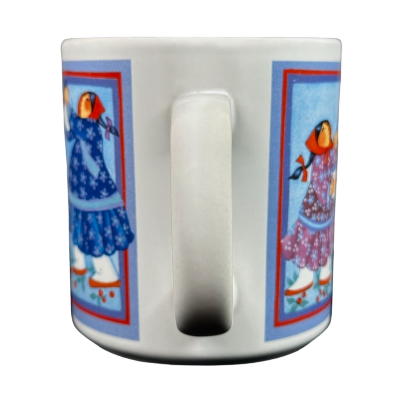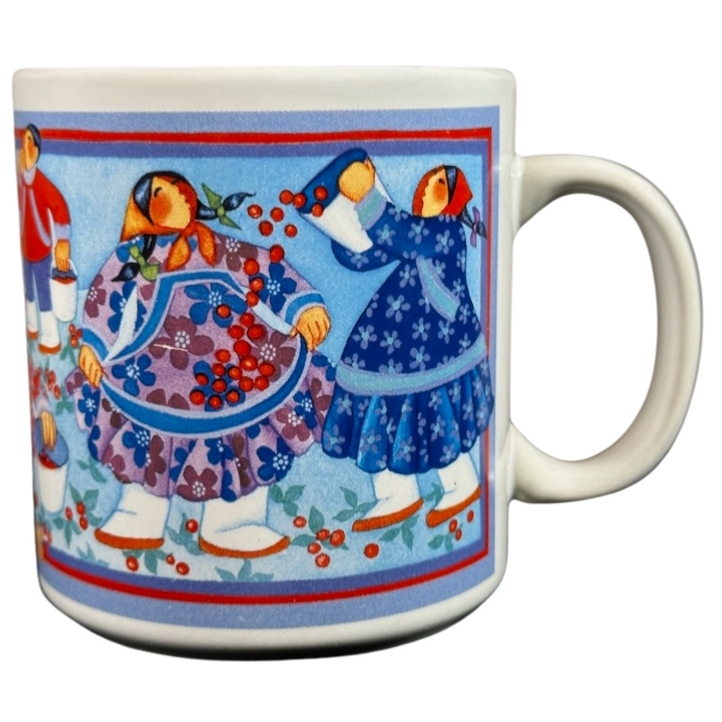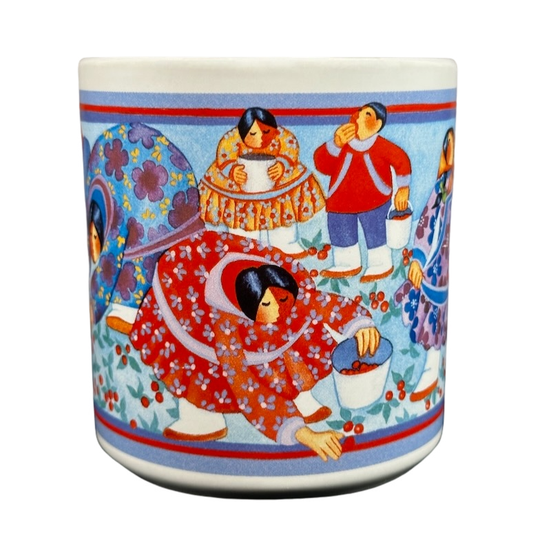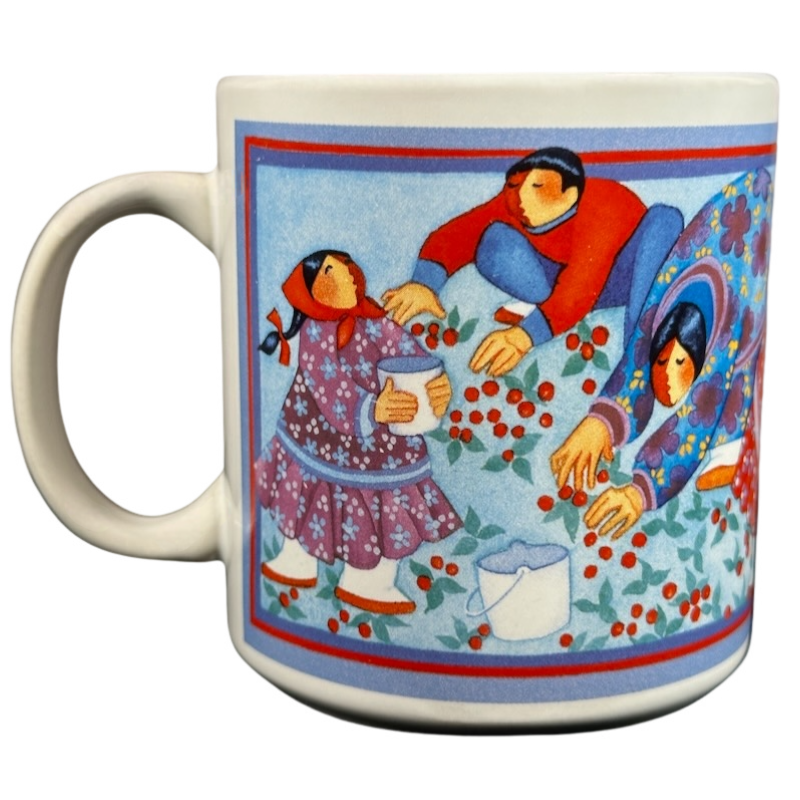 Features artwork wrapping around the exterior surface consisting of inuit people picking berries.