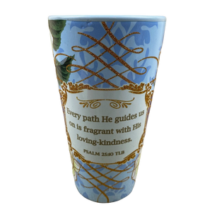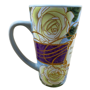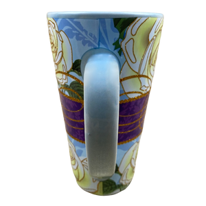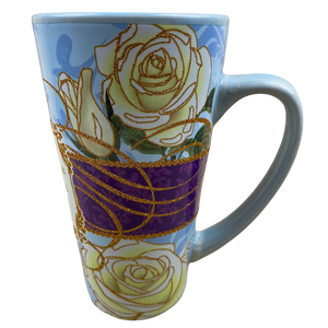This stunning mug features roses and lightly raised gold glitter accents wrapping around its exterior surface.