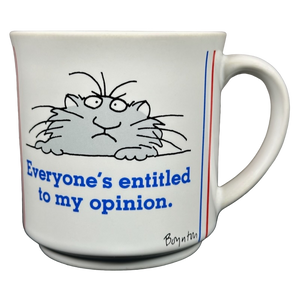 Features a cartoon cat on the front surface with “Everyone’s Entitled To My Opinion” printed just below it.