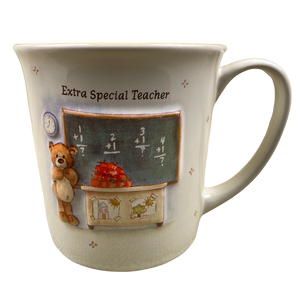 On the front is a bear standing near the teacher's desk which is in front of a chalkboard and has a stack of red apples on it.