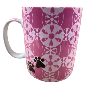 There is an abstract pattern of circles wrapping around the exterior surface and on the handle.