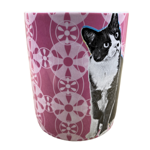Features a black and white cat on its front surface with the following printed to its right: