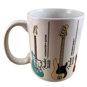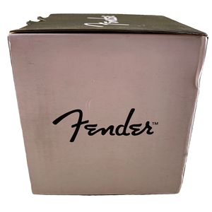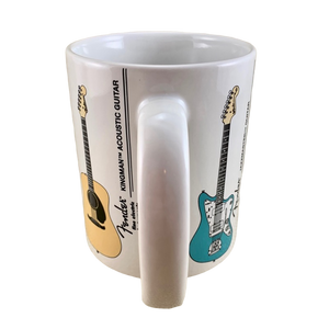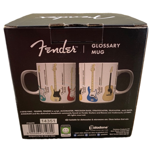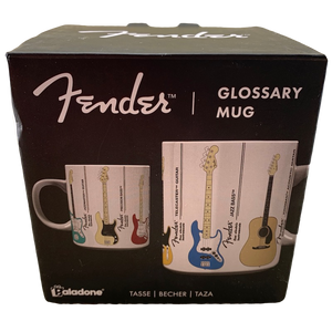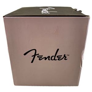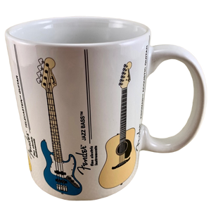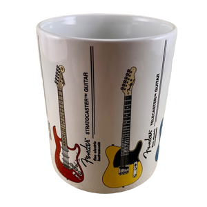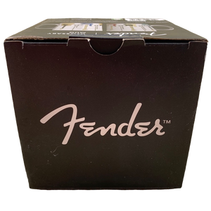 Features images of 6 different Fender guitars wrapping around its exterior surface. Each guitar is labeled vertically to its right.