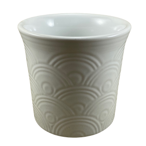 Features a pattern made up of semi circular objects wrapping around its exterior surface.