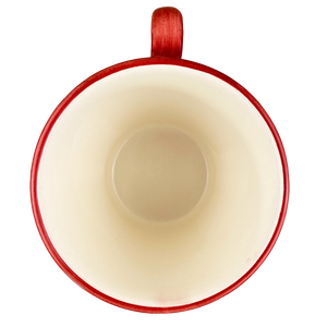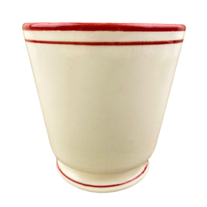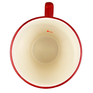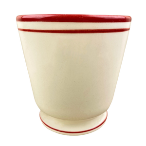 There is red trim wrapping around the base, the upper surface, and the rim.