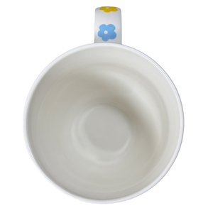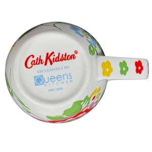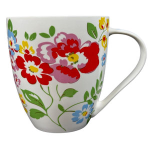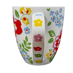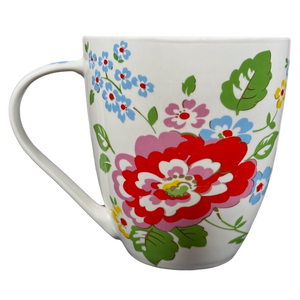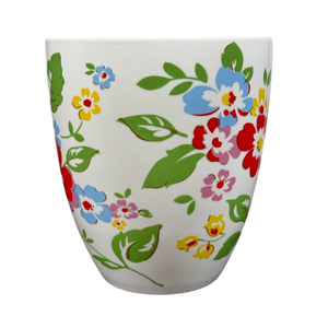 Features floral artwork wrapping around its exterior surface and on the handle.