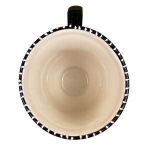 There is embossed white lines on the rim and the sides of the handle and black dots wrapping around the base.