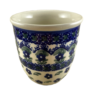 Features floral artwork wrapping around its exterior surface and on the handle.