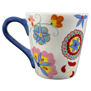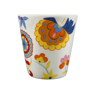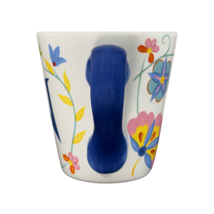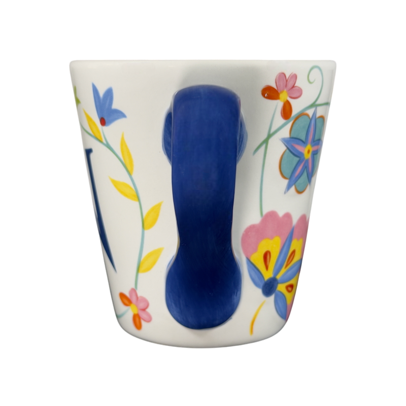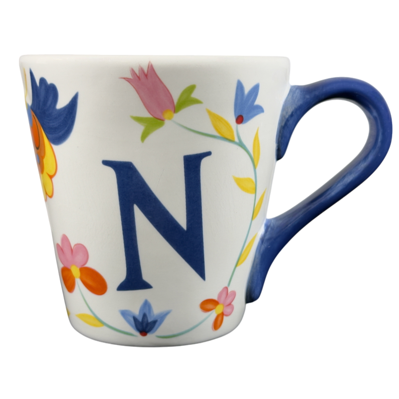 Features floral artwork wrapping around its exterior surface with the letter "N" printed in a large blue font on the front surface.