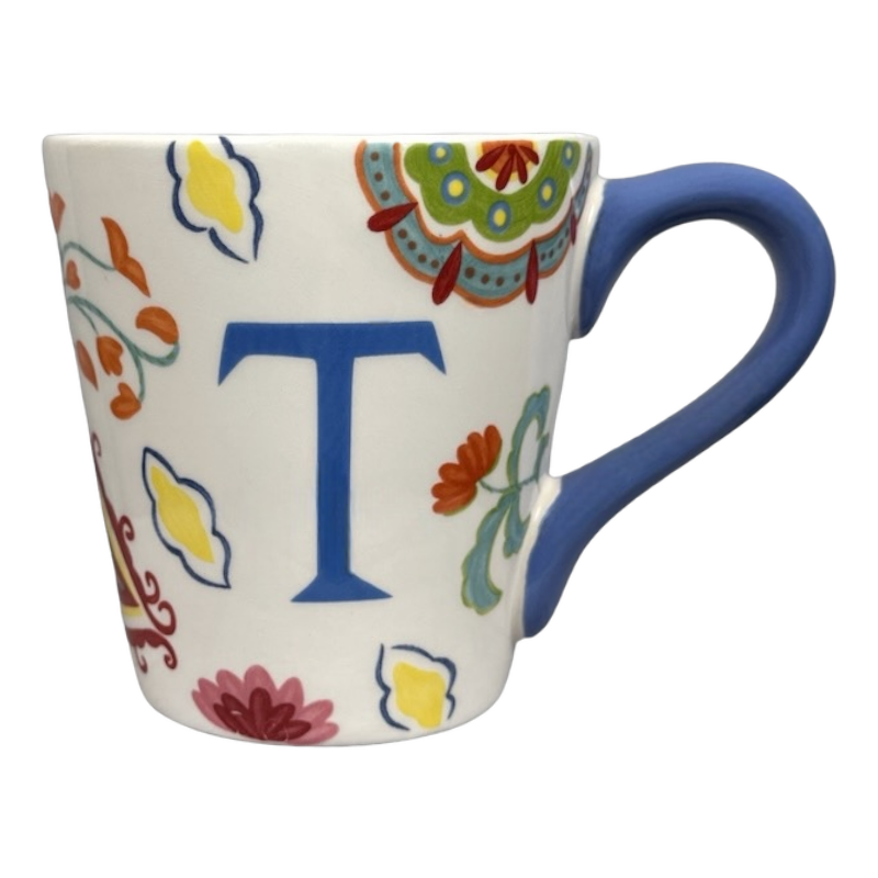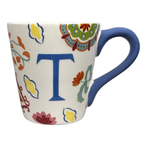 Features floral artwork wrapping around its exterior surface with the letter "T" printed in a large medium blue font on the front surface.