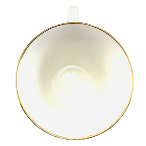 Has gold trim on the entire rim and a bit of gold accent on the handle.