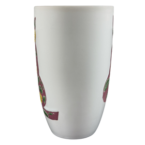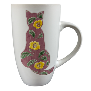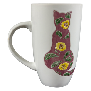 This mug features a detailed embossed cat silhouette adorned with elegant floral motifs.