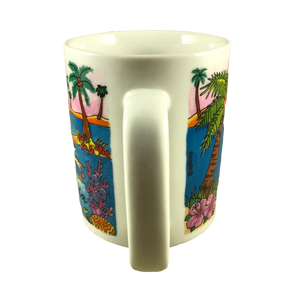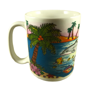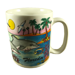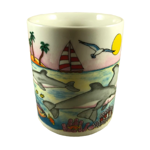 Features artwork encircling the mug featuring the ocean, dolphins, seagulls, fish, coral, flowers, palm trees, a sailboat, and other Florida and beach related things.