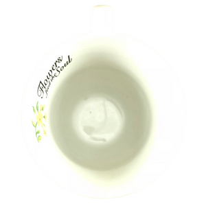 Inside on the rear upper surface is a bunch of yellow flower with the following next to them printed in a cursive font: