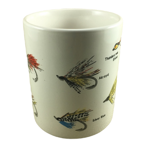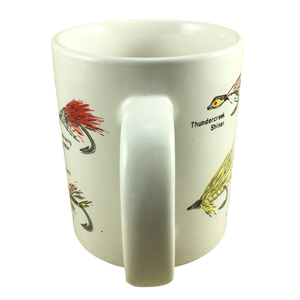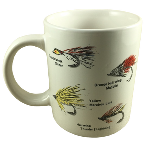 Features 6 different named fishing lures wrapping around its exterior, some are repeated.