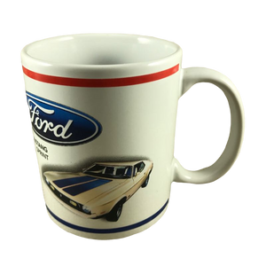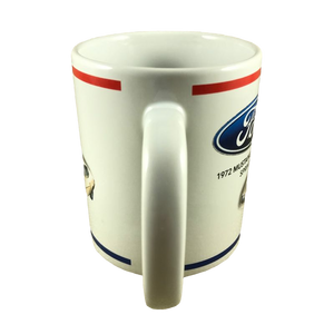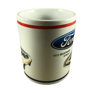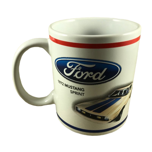 Features the same artwork on the front and back of the mug consisting of a Ford logo inside a blue oval on the top left and a 1972 Mustang Sprint car to the lower right. Just above and to the left of the car between it and the logo is printed "1972 Mustang Sprint"