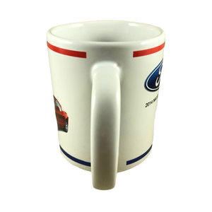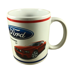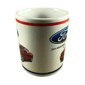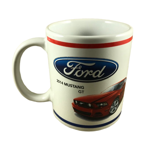 Features the same artwork on the front and back of the mug consisting of a Ford logo inside a blue oval on the top left and a 2014 Mustang GT car to the lower right. Just above and to the left of the car between it and the logo is printed "2014 Mustang GT"