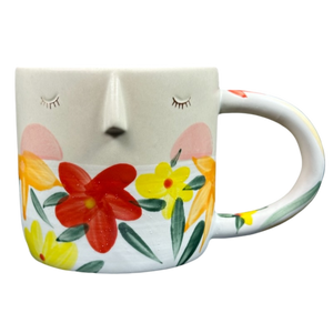 There is a nose embossed on the front surface above the floral artwork with closed eyes painted to the left and right of the nose.