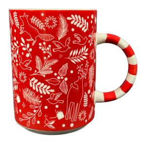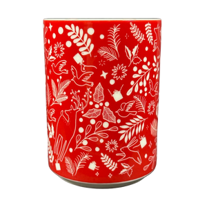 Features a pattern of leaves, doves, and foxes wrapping around its exterior surface.
