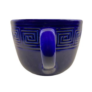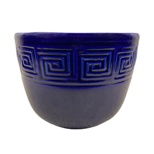 Features a pattern of repeating geometric shapes wrapping around its upper exterior surface.