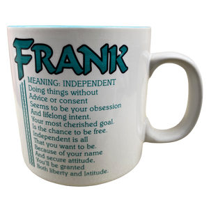 Features the name FRANK printed in a large font at the top of the front side of the mug. Directly underneath this is a poem about the name FRANK.