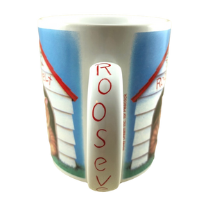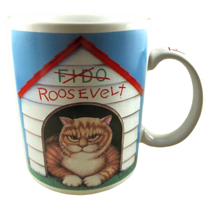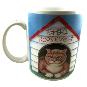 Whimsical mug features the same artwork on the front and rear surfaces consisting of a cat sitting in a dog house. Above the cat the name FIDO is crossed out and replaced with ROOSEVELT, both are written in a handwritten style font.