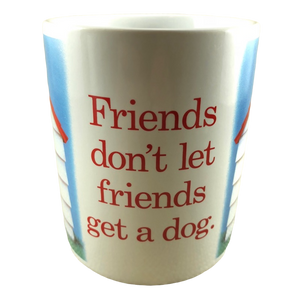 Printed on the left side of the mug in a large red font is "Friends don't let friends get a dog."