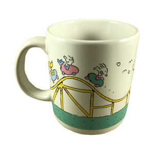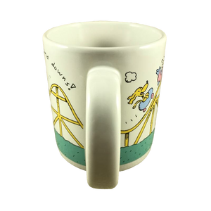 A cute roller coaster with animals riding in the cars is present around the exterior of the mug.