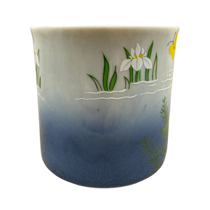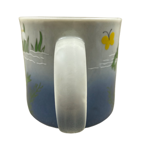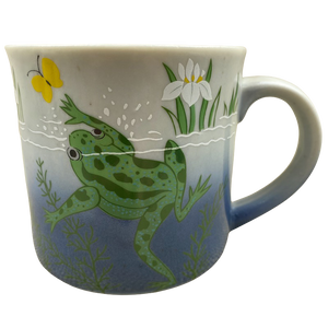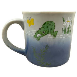 It features artwork wrapping around its exterior surface depicting a frog in the water and a yellow butterfly.