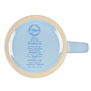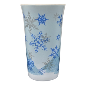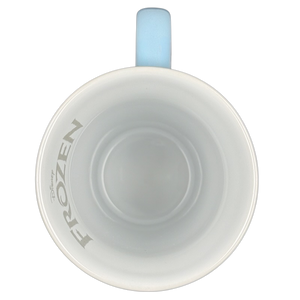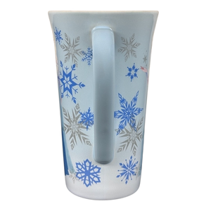 Surrounding Elsa and wrapping around the mug are blue and silver snowflakes of various sizes.
