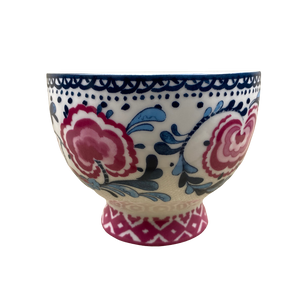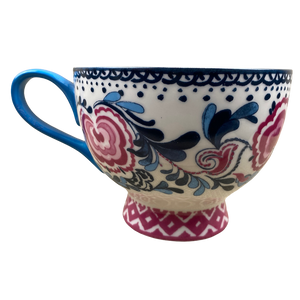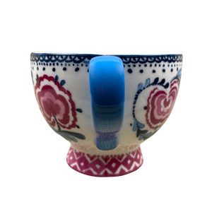 This is a footed mug with pink trim wrapping around its base.