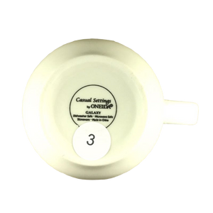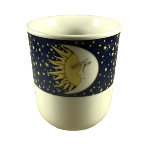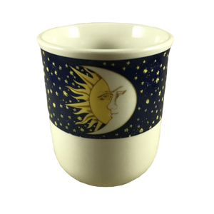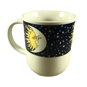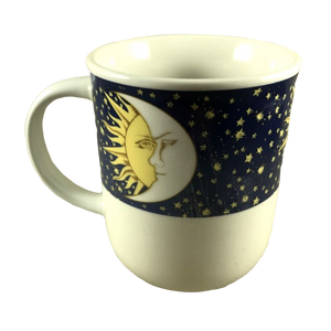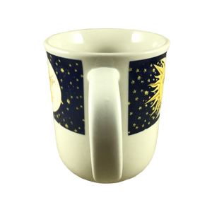 Features the sun and moon combined together in three spots in a star filled sky which wraps around the upper half of the exterior surface of the mug.