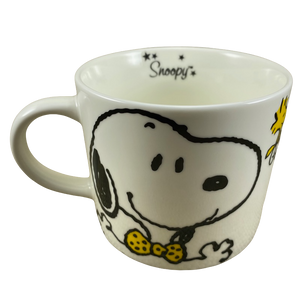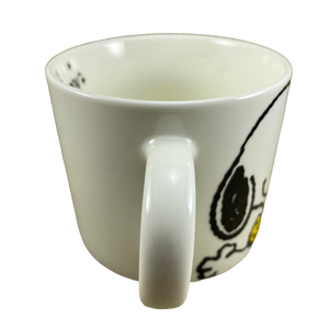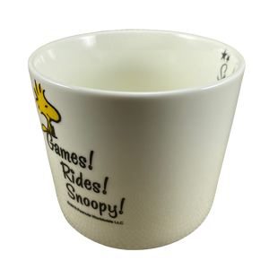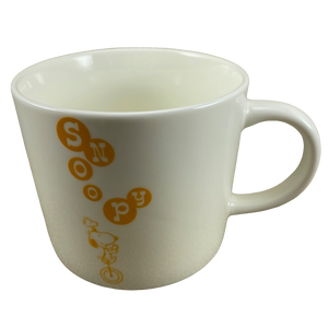 This is an extremely rare Peanuts mug! It features an image of Snoopy riding a unicycle with Woodstock on his head on its front surface with his name above him. Each letter is contained inside an orange balloon.