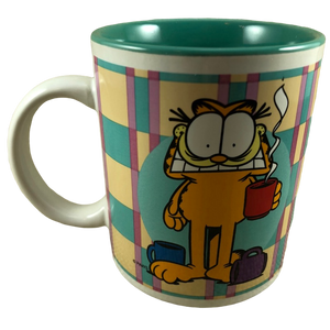 On the rear surface is an image of Garfield smiling and holding a cup of hot coffee.