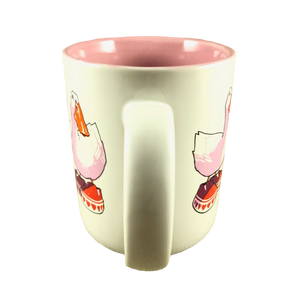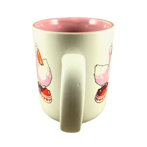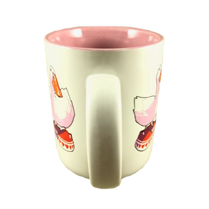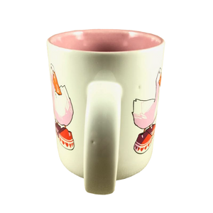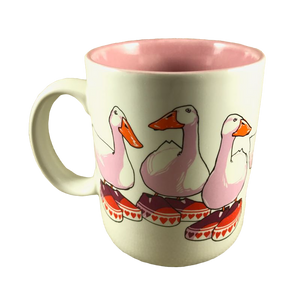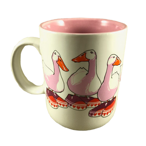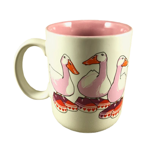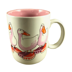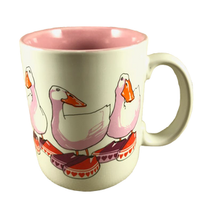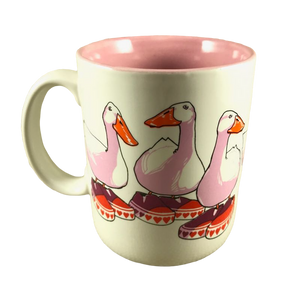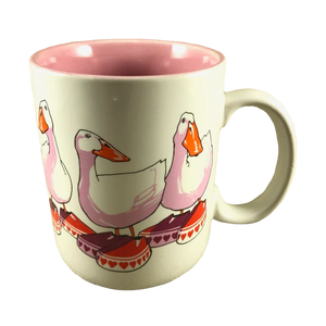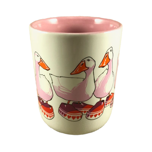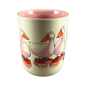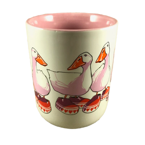 Features artwork wrapping around its exterior surface depicting geese wearing shoes that have hearts on them.