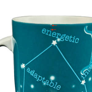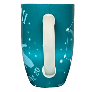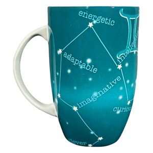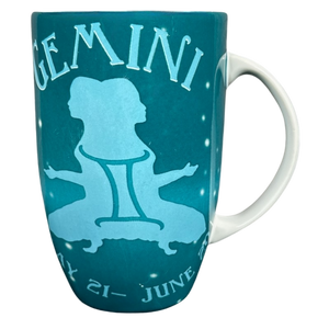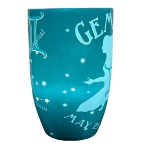 This is a tall mug that features artwork on its front and rear surface depicting the Zodiac sign GEMINI.