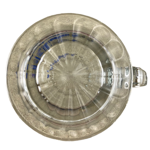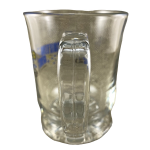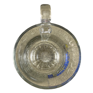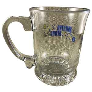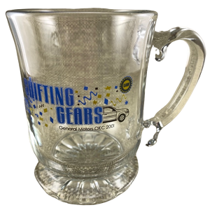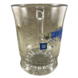 This is a sturdy glass mug with a scalloped pedestal base that features the GM logo on its front left surface.