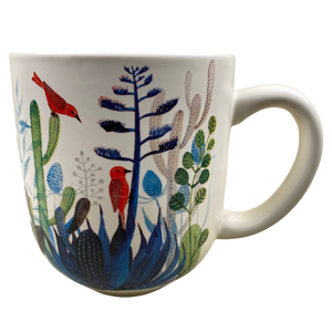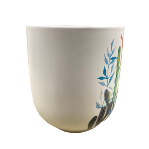 Features beautiful artwork wrapping around its exterior surface depicting cactus and birds.