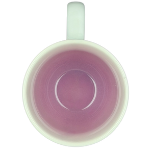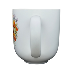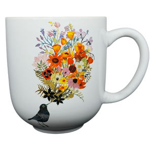 This charming hallmark ceramic mug features a whimsical illustration of a small dark bird chirping out a vibrant explosion of colorful wildflowers. the bouquet includes a variety of botanical elements like bright orange poppies, yellow blossoms, and purple sprigs that wrap around the front of the clean white ceramic body. with its generous rounded shape and a striking interior that transitions from a light lavender at the rim to a progressively darker lavender at the bottom, this mug is both a functional kitchen essential and a lovely decorative piece for bird lovers and gardeners alike. it is microwave and dishwasher safe for easy daily use and bears the official hallmark branding on the base.