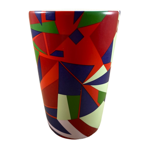 Features an abstract geometric pattern wrapping around its exterior surface.