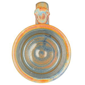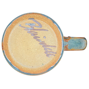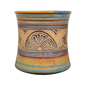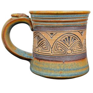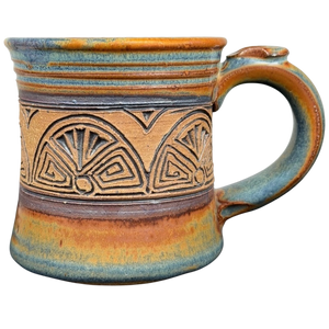 This handcrafted studio art pottery mug features an earthy, multi-tonal glaze with a stunning blend of rustic orange and blue accents. The center of the vessel is detailed with a wide, hand-carved band showcasing an intricate geometric sunburst or fan pattern that adds a beautiful tactile element to the stoneware. Its robust silhouette is complemented by a sturdy, wide-set handle, making it as functional for daily use as it is striking for display. The base is finished with a large, stylized artist signature in a contrasting glaze, marking it as a unique piece of artisanal pottery with significant character and charm.